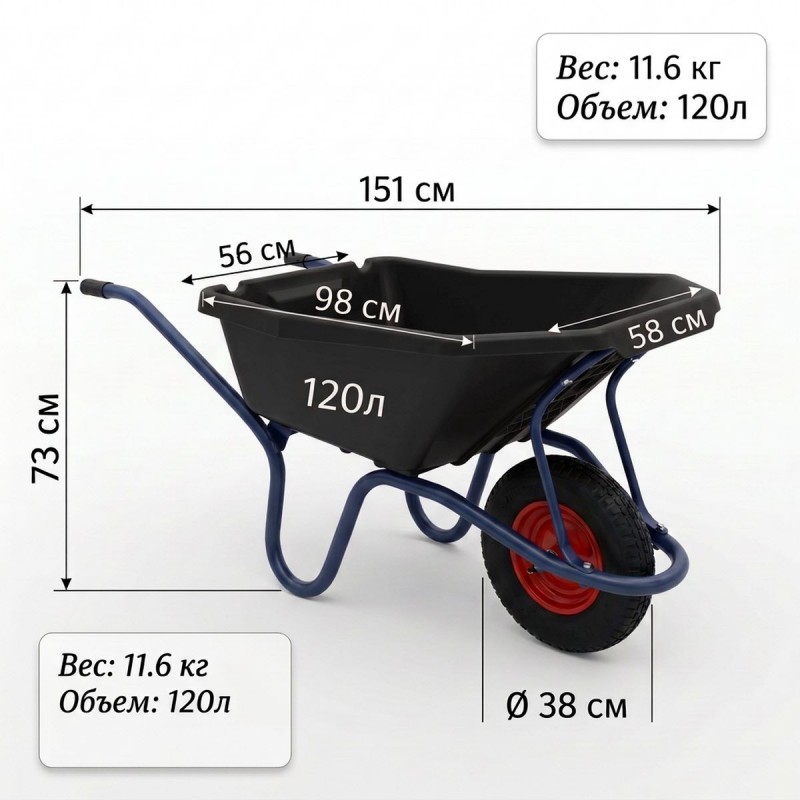 - Объем корыта: 120 л — оптимальный выбор для строительных, садовых и дачных работ.