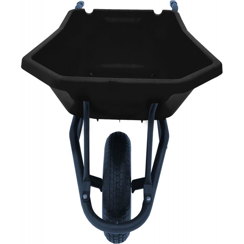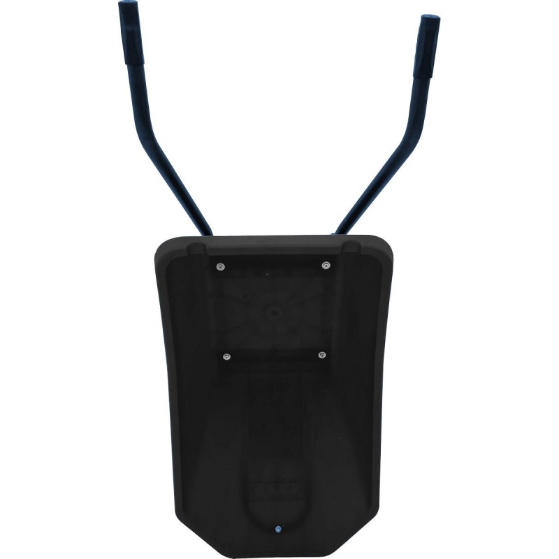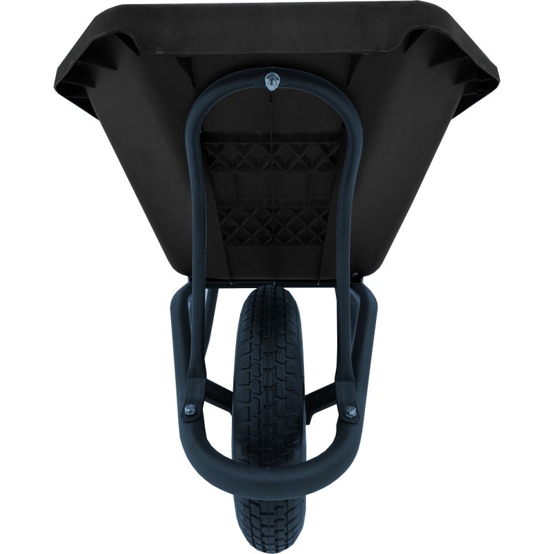 Корыто объемом 120 литров выполнено из ударопрочного пластика, устойчивого к ударам, перепадам температур и ультрафиолету. Черный цвет — особенно практичное решение: на таком кузове меньше заметны загрязнения, он не выцветает и сохраняет опрятный вид долгие годы. Пластик не ржавеет, легко моется от бетона и грязи, а гладкая поверхность облегчает выгрузку налипших материалов. Производитель предоставляет гарантию на кузов 5 лет.