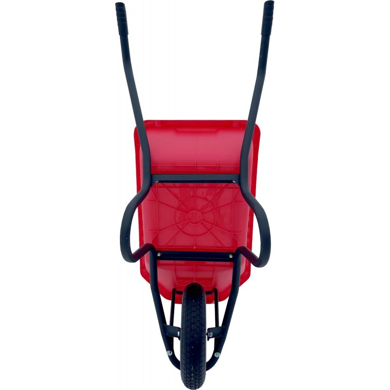 Рукоятка тачки сварена из стальной трубы диаметром 32 мм с толщиной стенки 1,5 мм и имеет эргономичный изгиб. Такая конструкция позволяет толкать тачку двумя руками, сохраняя равновесие и снижая нагрузку на спину. Рама усилена, что гарантирует ее долговечность даже при интенсивной эксплуатации.