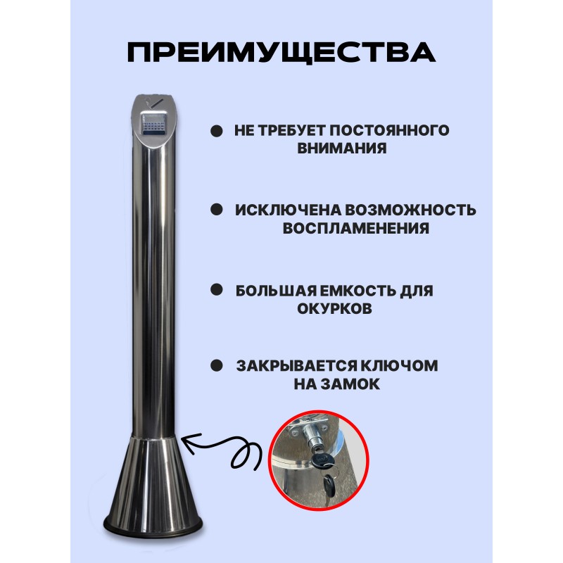 — это стильная и практичная пепельница для помещений из полированной нержавеющей стали. Идеальное решение для офиса, кафе, ресторана, курительной комнаты или веранды. Объем 12 литров, замок для запирания, съемный стакан. Купить урну для офиса по выгодной цене.
