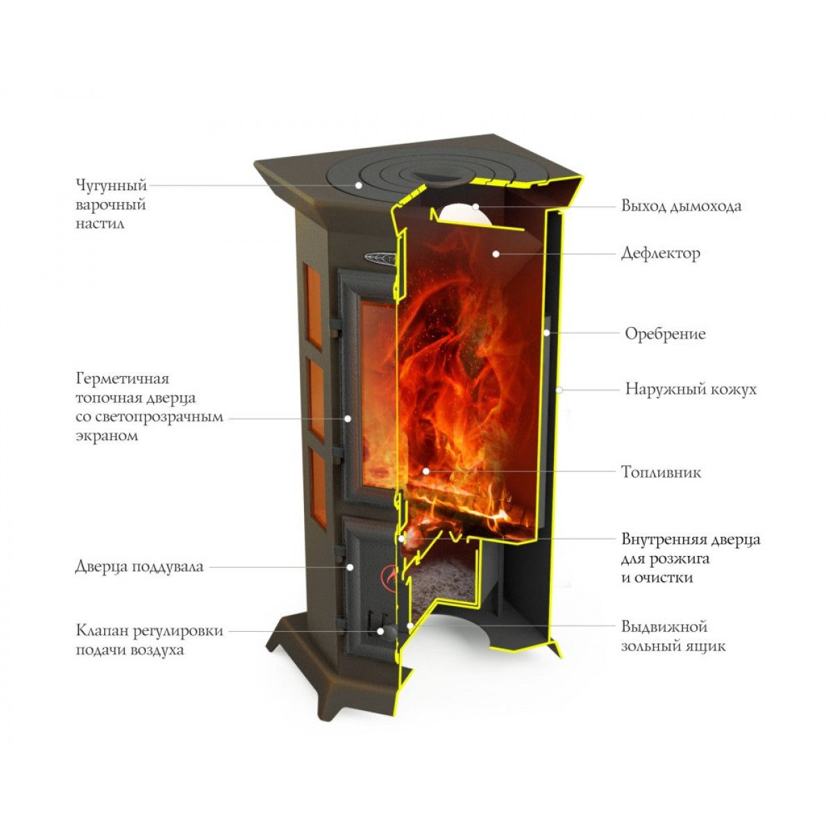 Развитое оребрение боковых поверхностей топливника существенно увеличивает теплоотдачу, увеличивает его жесткость, исключая деформацию при работе печи. Внутренние панели, закрывающие ребра, обеспечивают дополнительное экранирование помещения от жесткого инфракрасного излучения. Снаружи топливник печи охвачен наружным кожухом. Конвекционные отверстия на боковых и задней стенках, отверстие в нижней части задней стенки и отверстие в центре основания печи обеспечивают свободную циркуляцию воздуха. За нижней чугунной дверцей располагается внутренняя дверца для розжига или очистки от золы.